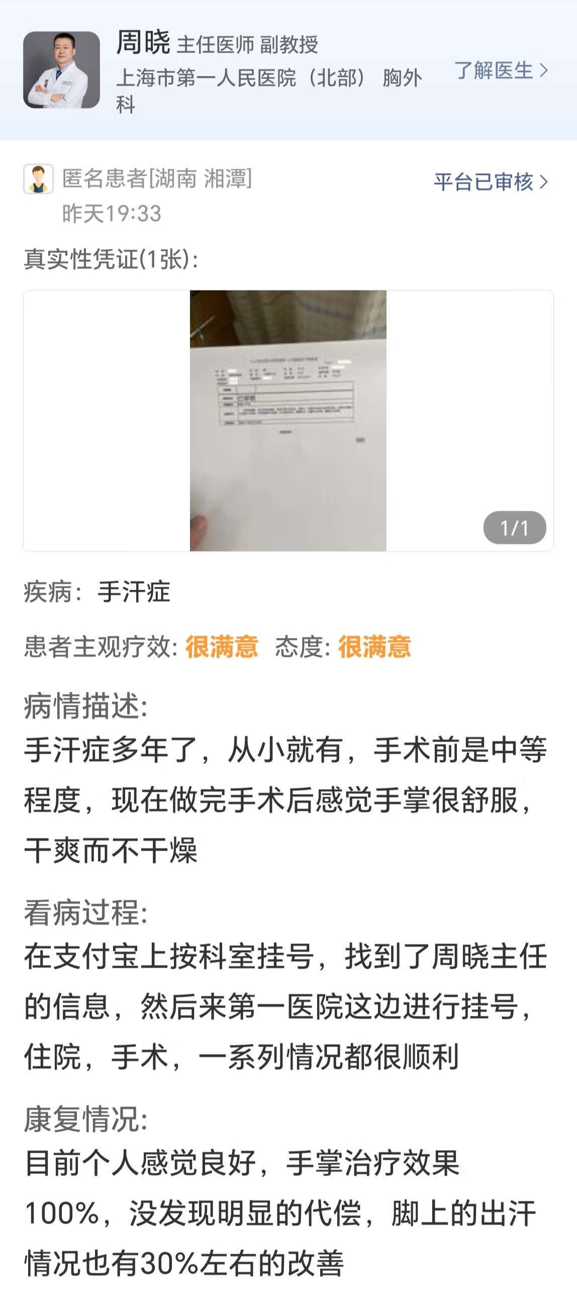 手汗症多年了,从小就有,手术前是中等程度,现在做完手术后感觉手掌很舒服, 干爽而不干燥