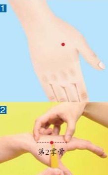 ①合谷穴:手背,第一、二掌骨之间,约平第二掌骨中点处,以一手的拇指指骨关节横纹,放在另一手拇、食指之间的指蹼缘上,当拇指尖下。