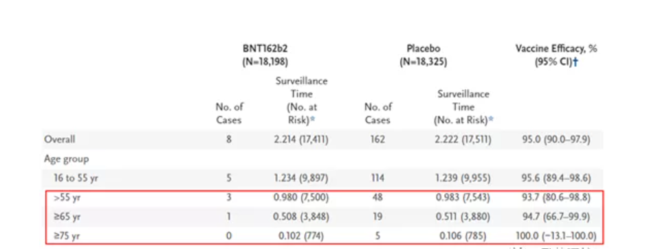 以上结果均提示,mRNA 新冠核酸疫苗在高龄人群中具有与整体人群一致的高保护效力(见表 1)。