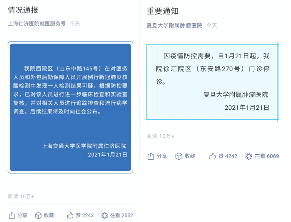 当日夜间,「上海复旦大学附属肿瘤医院」和「上海交通大学医学院附属仁济医院」医院公众号相继发布通知,在对医务人员和外包后勤保障人员开展例行新冠肺炎核酸检测后,两院均发现一人检测结果可疑。