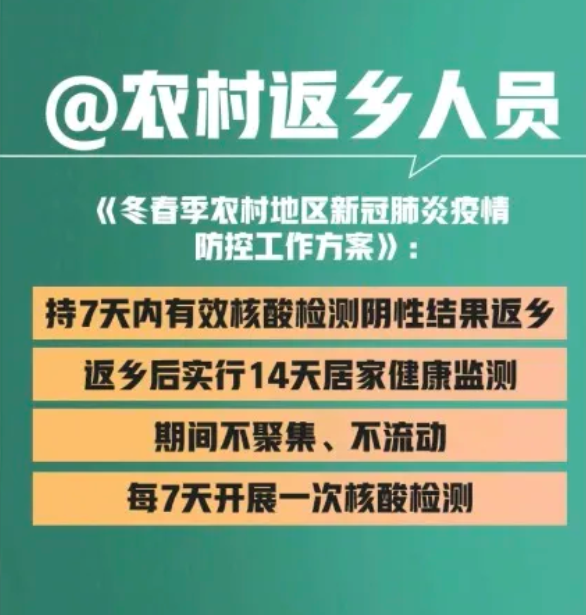 据卫健委 1 月 20 日发布的《冬春季农村地区新冠肺炎疫情防控工作方案》,返乡后实行 14 天居家健康监测,期间不聚集、不流动,每 7 天开展一次核酸检测。