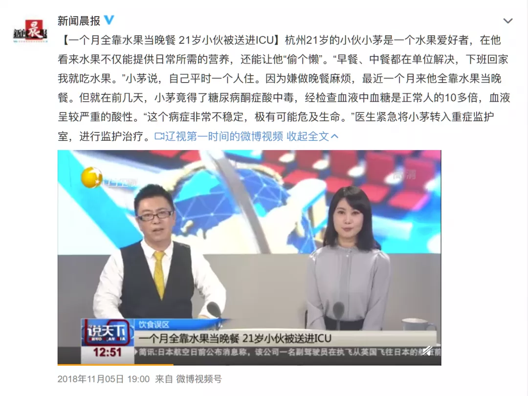这不,之前在网络上热议的新闻“一个月全靠水果当晚餐,杭州21岁小伙被送进ICU”,一时把水果减肥推上风口浪尖,用真实案例说明,水果代替晚餐减肥,真的很不明智。
