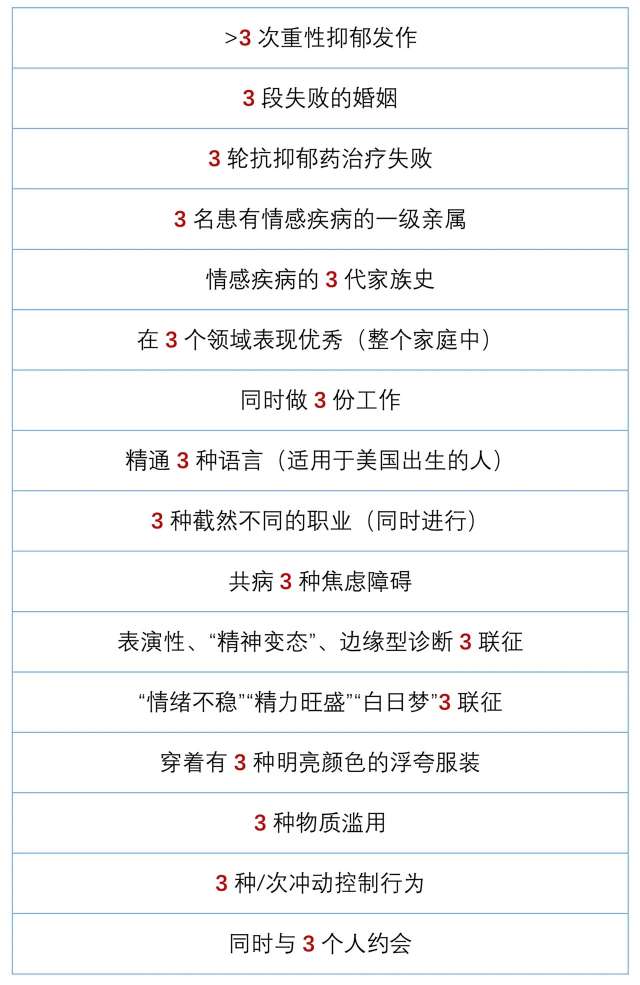 Akiskal博士将上述行为线索归纳为「3法则」(the rule of 3),如表1。